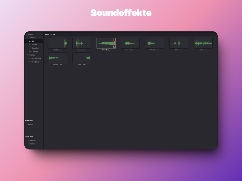 - Sound-Effekte: Professionell abgestimmte Soundeffekte für Social Media Reels. Dazu gehören Whooshes, Riser, Klickgeräusche und Kameraeffekte.