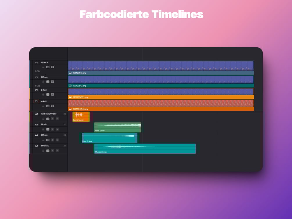 - Farbcodierte Zeitleisten: Unterschiedliche Auflösungen, Bildraten und Seitenverhältnisse, optimiert für YouTube und soziale Medien, sind für eine einfache Handhabung farblich kodiert. Mit einem Klick haben Sie alle Formate, Längenbegrenzungen und Frameraten innerhalb eines Projekts im Blick.